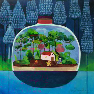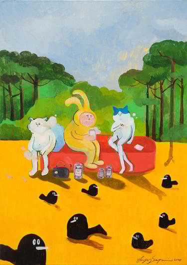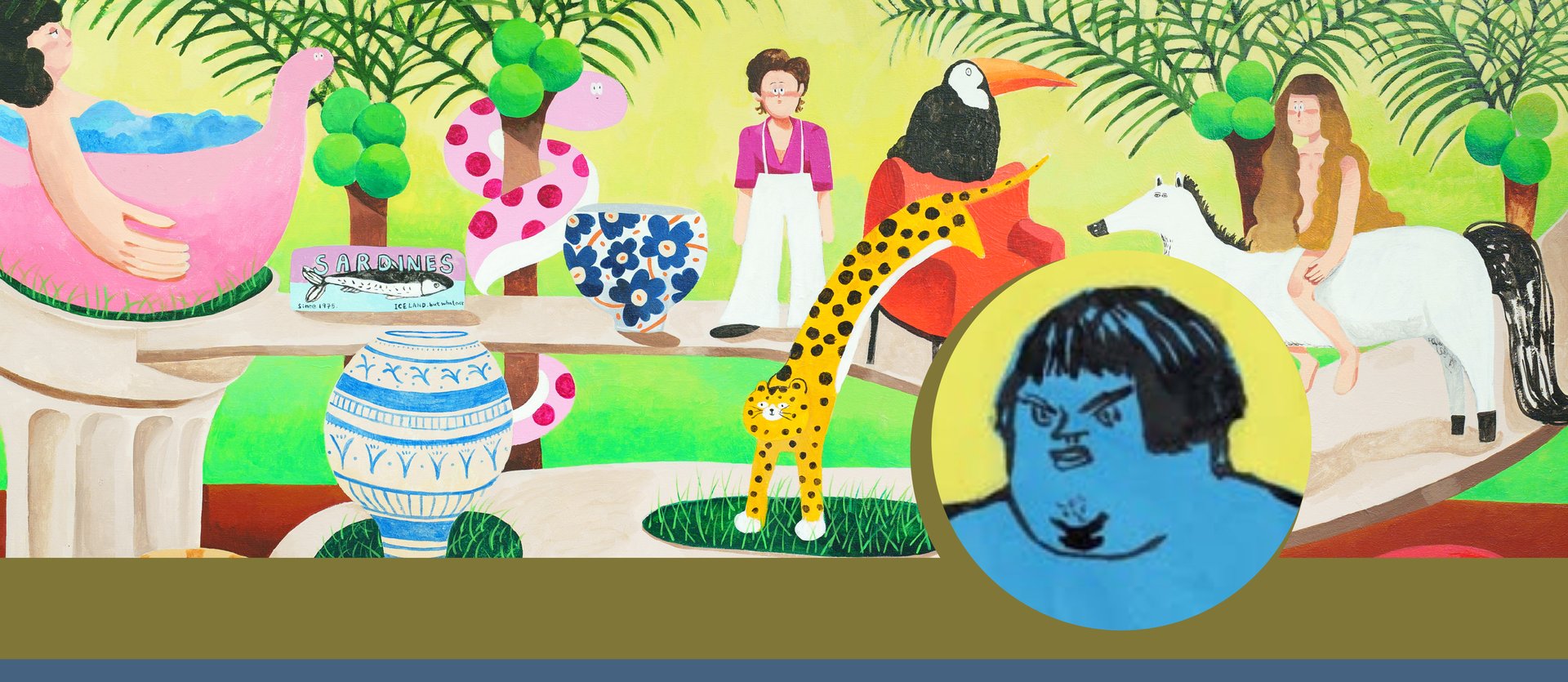 Q3. 你創作的人物大多身形龐大、表情豐富,亦常被大自然及食物圍繞着,你是希望藉畫作給人療癒的感覺抑或是其他原因?你是否也把自畫像置入畫中嗎?