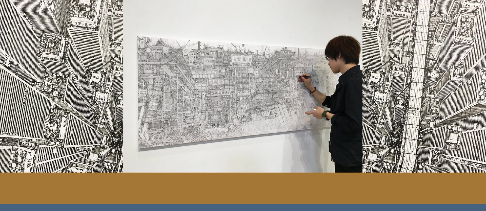 來自奈良的日本藝術家田島大介(Daisuke Tajima)深信手繪的力量,靠著一支漫畫專用的沾水式鋼筆,將一幕幕現代化城市急速發展的象徵,如摩天大樓、大型基建、造船廠等,刻畫在常用於建築草圖或繪製漫畫的肯特紙上,創作一幅幅超現實的都市建築藍圖。