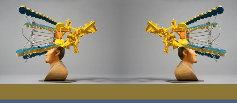 泉啓司的木雕作品圍繞「人物」主題,他以身邊熟人為創作靈感,並非復刻肖像,而是融合具象與抽象訊息,形成心像風景。創作過程包含回憶與思索,將多個獨立鑿刻的木頭零件(球體、木條、金屬支架等)建構組合,象徵人物性格中勇敢、奇想與好奇心的幾何語彙。