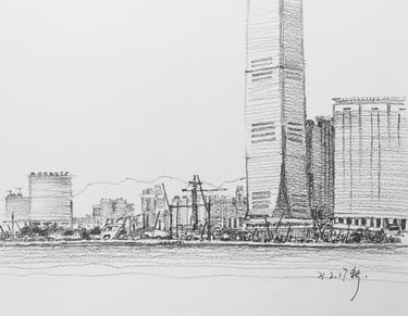 2010年我無意間開始創作《午飯速寫》系列,有段時間每逢星期六我要到西貢教畫,有次一位學生從英國回來度假,送了的一套水彩工具,由於當時我只用鉛筆畫樹,所以便一直將這套工具閒置。我是在上環上班,午飯時間跟所有「打工仔」一樣,快速填飽肚子便四處逛做自己事,飯後我最喜歡到港澳碼頭看海,吹著海風望去對岸的西九十分舒服。某天突然想起家中這套水彩禮物,看看手錶時間為下午1:30,距離工作還有半小時,心想應該有足夠時間畫一張速寫,於是第二日我便開始嘗試創作《午飯速寫》系列,最初是由水彩開始,後來為了更方便而轉用鉛筆,而且消費較平。”