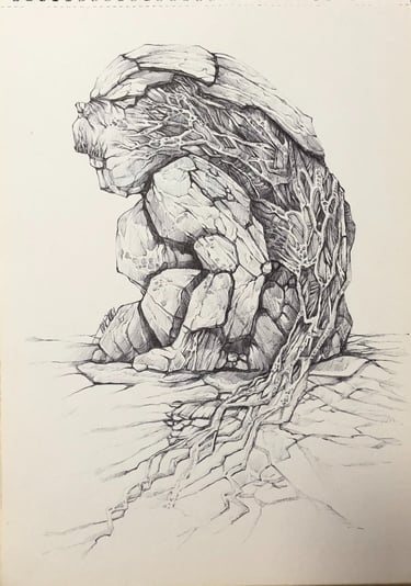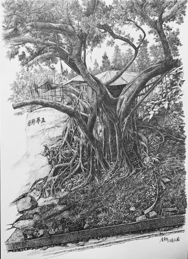 “2006年是迷惘期,沒有創作方向,甚至想放棄畫畫,這段時間常常畫些無聊的東西出來,例如:利用樹根的型態去編織一些圖像,由於是憑空想像,以為樹根很簡單,所以畫出來效果不是我想要的,於是開始到公園觀察樹根型態及分佈,並開始畫樹根作練習,之後在網上尋找樹根的資料,發現政府官方的古樹名冊網頁,樹之旅便從這裡開始。當時真的著迷,差不多每星期都去找古樹,很多都較偏遠,最遠一棵在沙頭角,後來2008年一棵赤柱百年大樹倒下壓死一名女學生,之後陸續有大樹塌下的新聞,我便由尋找古樹轉移到市區的樹木。我由2006年開始畫樹,2017年舉辦了個人畫展《樹藝師》,記錄十年來在香港找尋的樹。