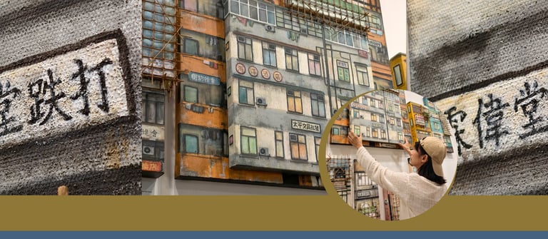 “我所挑選的唐樓,有些是歷史比較悠久的,例如戰前的唐樓,有些則是樓齡較新的,有高有低、破爛程度不同等。基本上取景選材都是遍佈全港不同地區,唯一共通點是這些外牆都具有不同的特色,例如這個位於上環,上面寫著「有記俠」的大廈外牆,實物外牆原型是「有記合」,我覺得這個「合」字很有意思,所以改成了「俠」,就像一個鐵甲俠一樣,而這些吊棚架就像在孕育這個鐵甲俠一樣。”